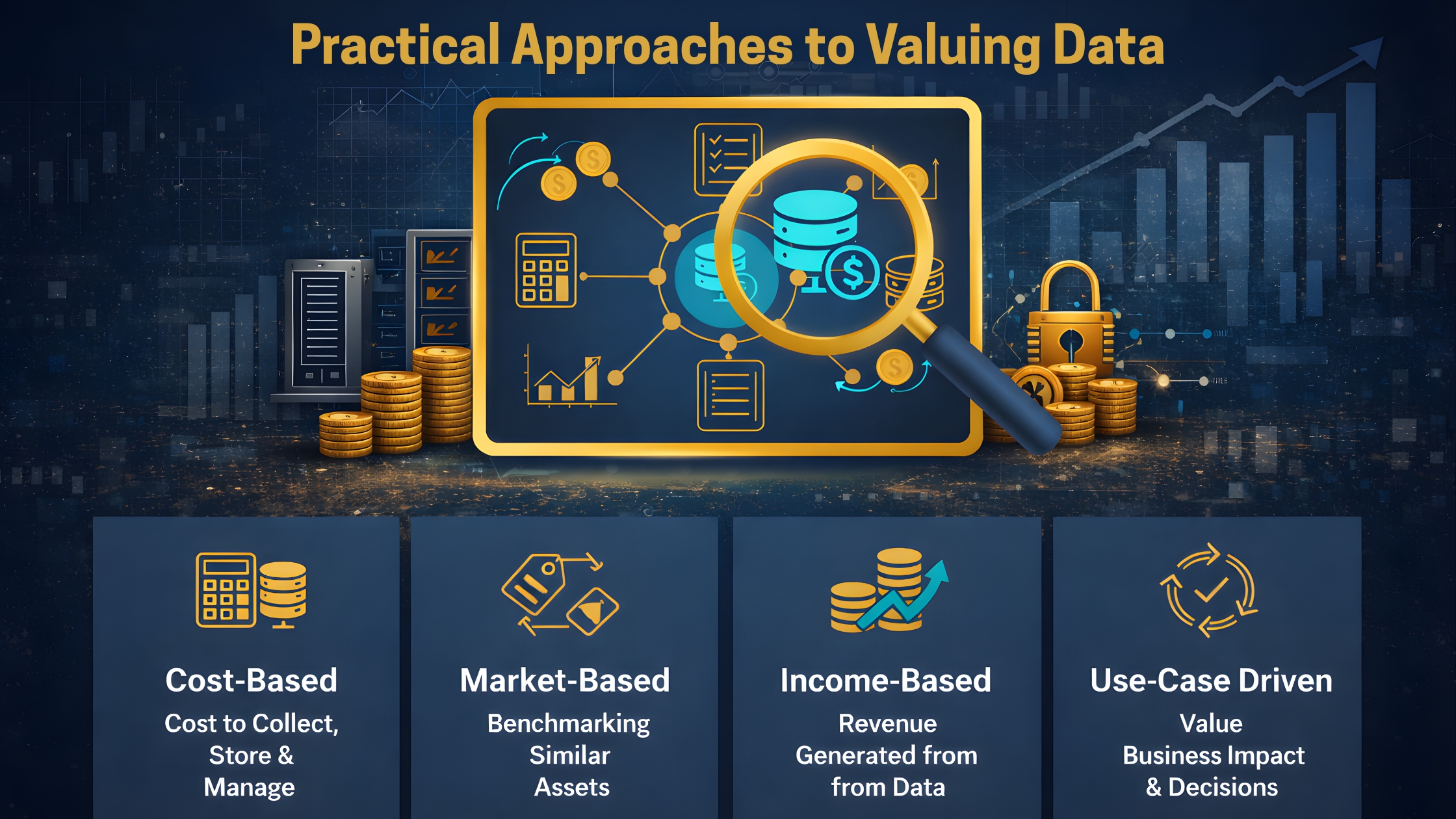 Measures the cost of collecting, storing, managing, and securing data. This method is simple but does not capture the full business value.
